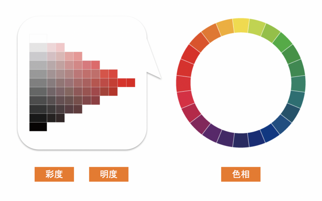 色は彩度、明度、色相の3つの要素に分けることができます。