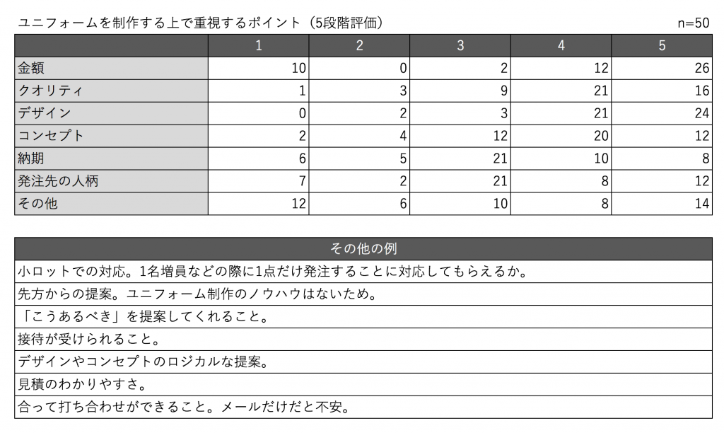 それではさっそく見ていきましょう。まずこちらがユニフォームを制作する上で重視するポイントをまとめたものです。